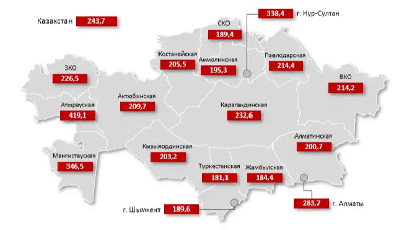 В тройке лидирующих регионов также оказались Мангистауская область (346,5 тыс. тг, плюс 6,2% в реальном выражении) и столица (338,4 тыс. тг, плюс 7,8%).