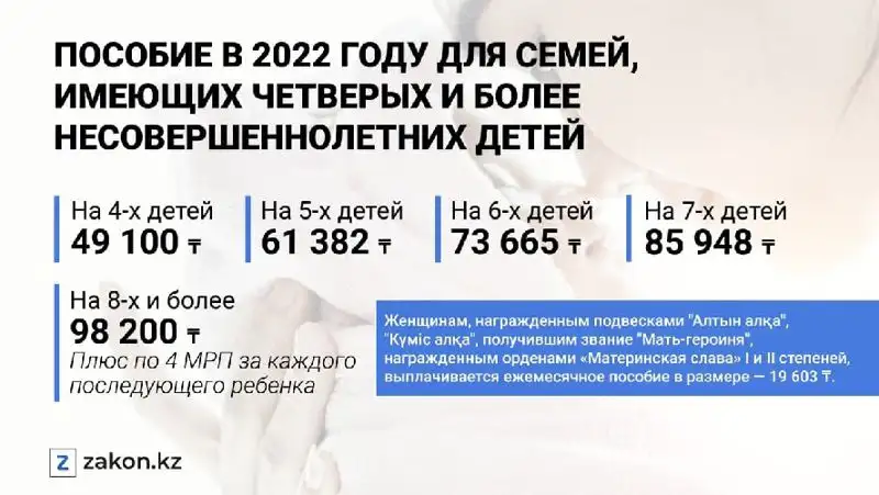 Женщинам, награжденным подвесками «Алтын алқа» (родившие и воспитавшие 7 и более детей), «Күміс алқа» (родившие и воспитавшие 6 детей) или получившим ранее звание «Мать-героиня», награжденным орденами «Материнская слава» I и II степеней, выплачивается ежемесячно государственное пособие в размере 6,4 МРП (19 603 тг).