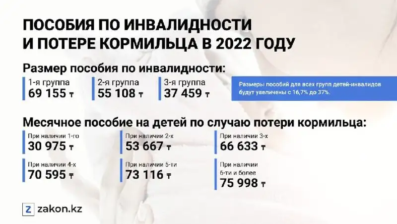В случае потери обоих родителей детям-сиротам пособие по случаю потери кормильца назначается в размере 1,18 ПМ (42 501 тг) на каждого ребенка, остальным нетрудоспособным членам семьи – в размере 0,54 ПМ (19 450 тг), но не более 2,56 ПМ (92 206 тг) на всех нетрудоспособных членов семьи.