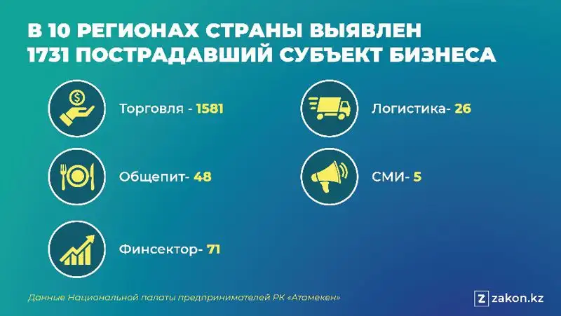 Так, по данным НПП «Атамекен», на 13 января 2022 года в 10 регионах страны выявлен 1731 пострадавший субъект бизнеса, из них в Алматы — 1591 субъект. Сумма ущерба оценивается более чем в 90 млрд тг.