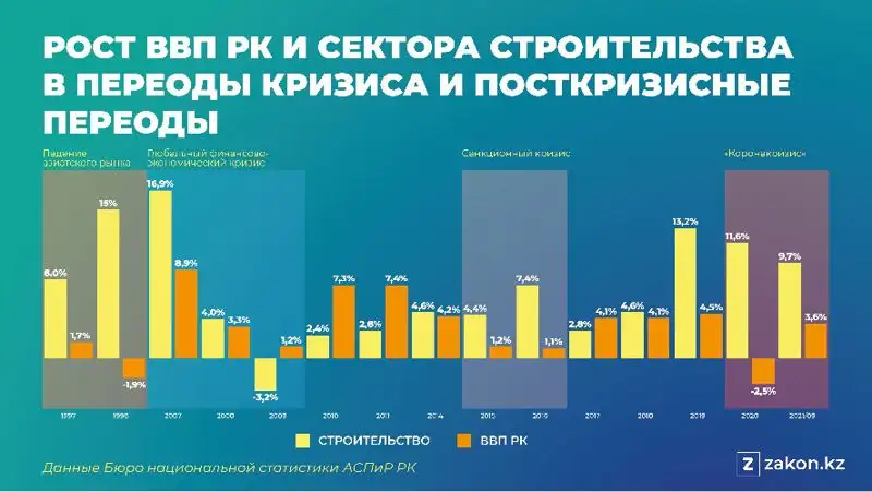В целом строительный сектор Казахстана устойчив к кризисным явлениям. Официальные данные показывают, что во времена экономических кризисов отрасль демонстрировала устойчивый рост. К примеру, во время падения азиатского рынка 1997-1998 годов строительная отрасль выросла на 8% в 1997 году и на 15% – в 1998-м, в то время как ВВП страны за аналогичный период показал рост всего на 1,7% в 1997 году и спад на 1,9% в 1998-м. Во время последующих кризисов наблюдалась аналогичная ситуация, подробно описанная в инфографике, представленной ниже.