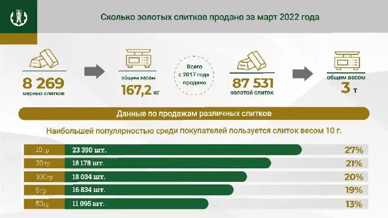 По данным Нацбанка, в марте 2022 года банками второго уровня и отдельными небанковскими обменными пунктами продано 8269 мерных слитков общим весом 167,2 кг, что в 2,9 раза больше в сравнении с аналогичным периодом 2021 года (2898 слитков весом 48,2 кг).