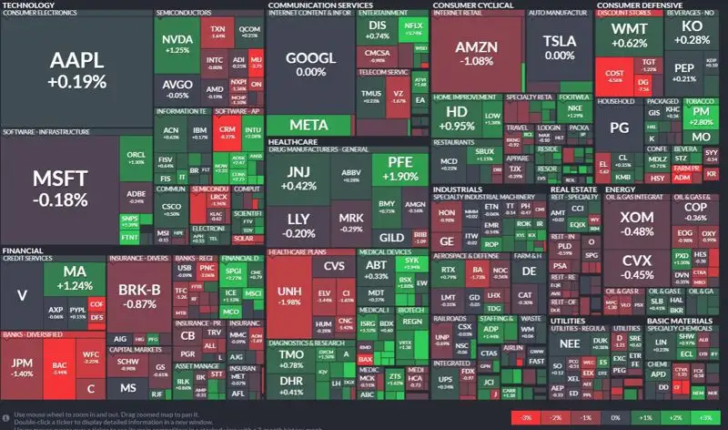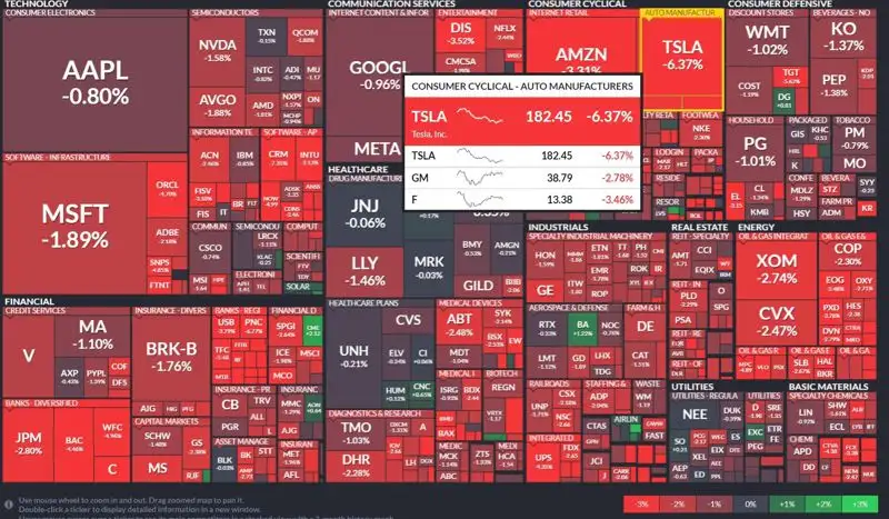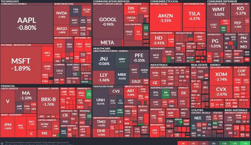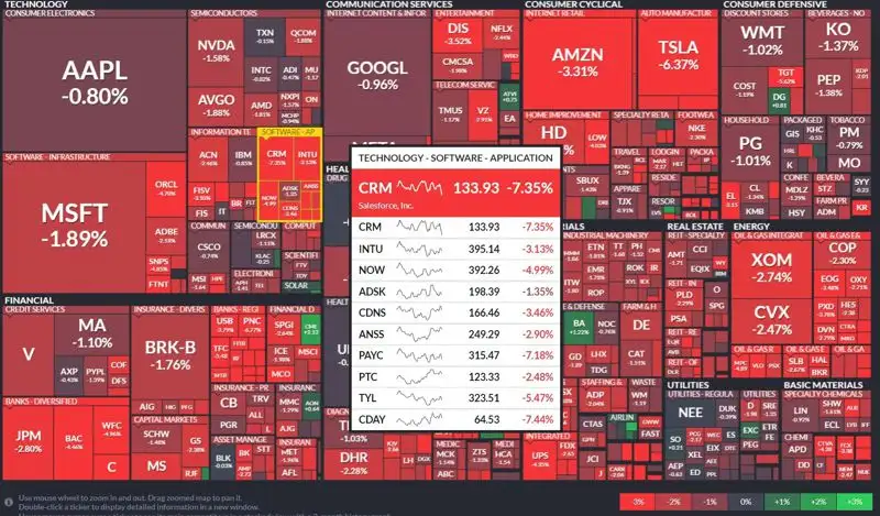 Лидерами падения стали бигтехи Salesforce, Inc., потерявшие за сессию 7,35%.
