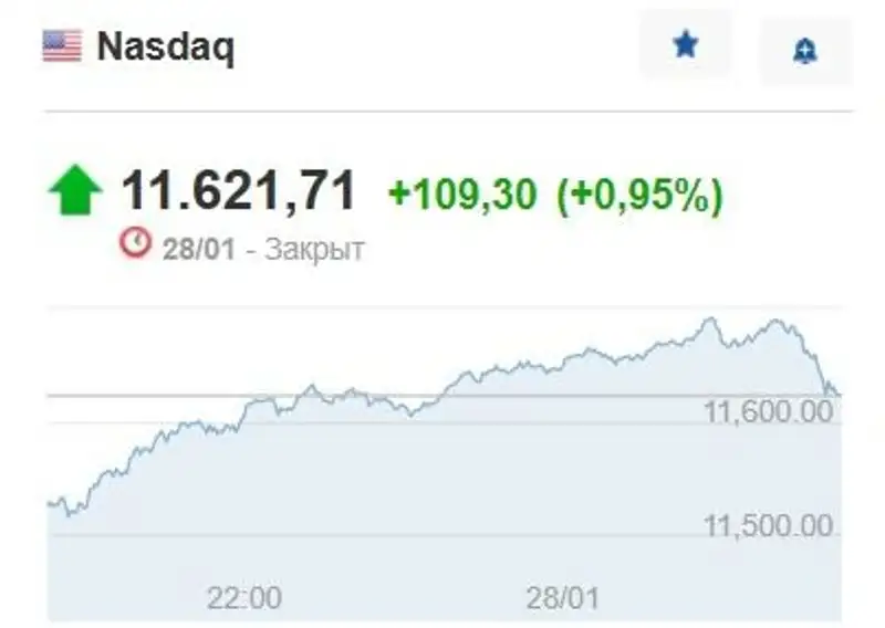 Nasdaq Composite прибавил 109,3 пункта (0,95%) и составил 11621,71 пункта.