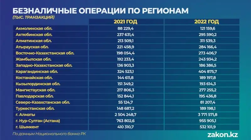В региональном разрезе лидером по безналичным карточным транзакциям как и в прошлом году остаются города Алматы, Астана и Шымкент. Наименьшее количество операций по картам проводилось в Северо-Казахстанской и Акмолинской области.