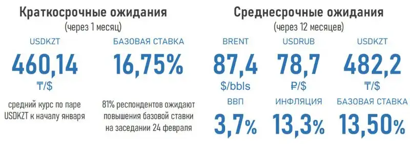 Эксперты практически единогласно (81%) ожидают сохранения базовой ставки на заседании 24 февраля. Но через год она может быть снижена до 13,5% годовых с текущего уровня 16,75% (−3,25 п.п.).