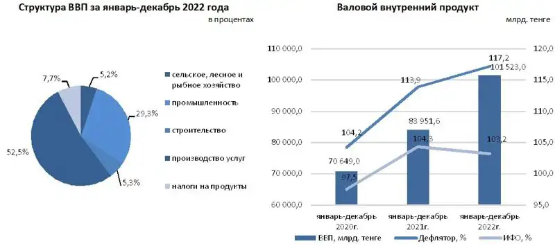 По предварительным оперативным статданным, Индекс физического объема (ИФО) валового внутреннего продукта (ВВП) за январь-декабрь 2022 года к январю-декабрю 2021 года составил 103,2%.