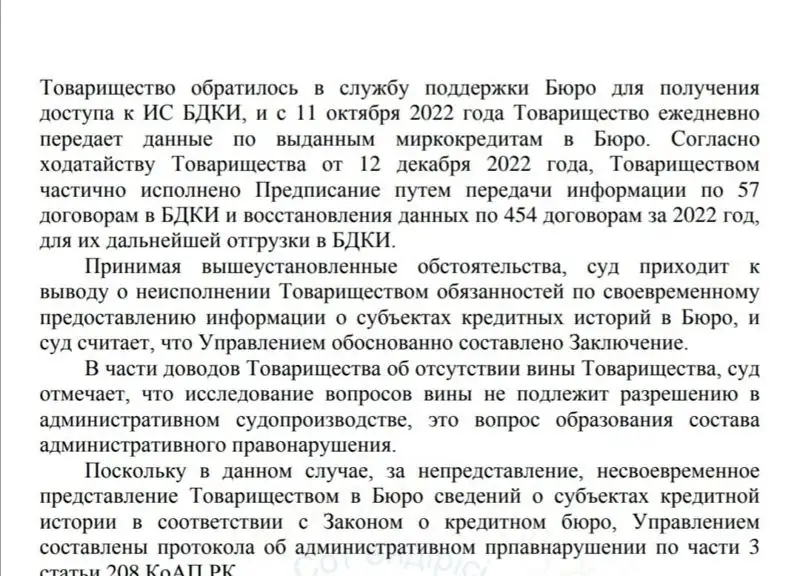 Согласно материалам дел, размещенных в открытой судебной базе, в 2022 году Агентство Республики Казахстан по регулированию и развитию финансовых рынков выявило факты непредоставления данных о выданных микрокредитах в Государственное кредитное бюро. МФО, объясняя ситуацию, сослались на отсутствие технической возможности подключения к Базе данных кредитных историй и в свою очередь приняли решение обжаловать предписание Агентства. Однако к устранению нарушений все же приступили. Один из ломбардов уведомил, что передал информацию по 57 договорам и ведет работу по еще 454 договорам за 2022 год.