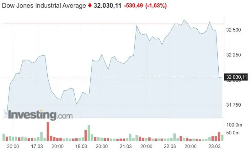 Промышленный Dow Jones к закрытию торгов стал дешевле более чем на полтысячи пунктов.