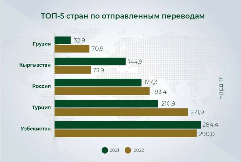В топ-5 по отправленным переводам вошли Грузия, Кыргызстан, Россия, Турция, Узбекистан.