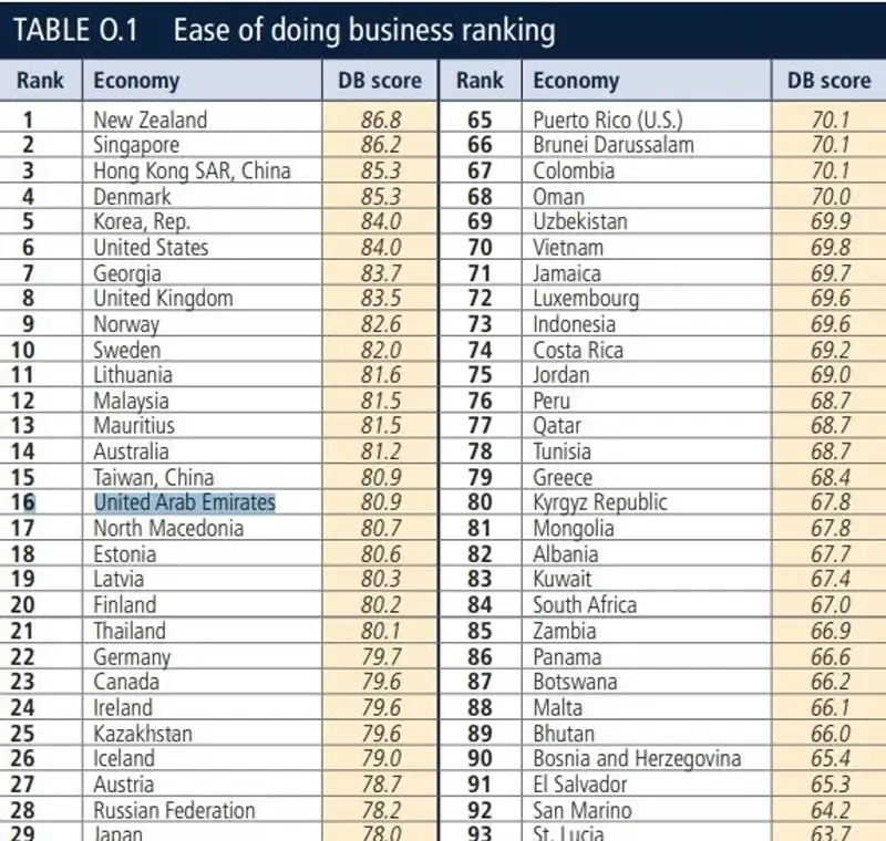 Всемирный Банк ежегодно публикует рейтинг Doing Business, отражающий сложность открытия и ведения собственного бизнеса в разных странах мира. Согласно отчету за 2020 год, из 190 стран Эмираты находятся на 16 месте в рейтинге легкости ведения бизнеса. Кстати, Казахстан оказался на 25 месте.