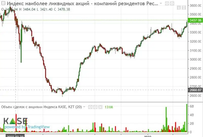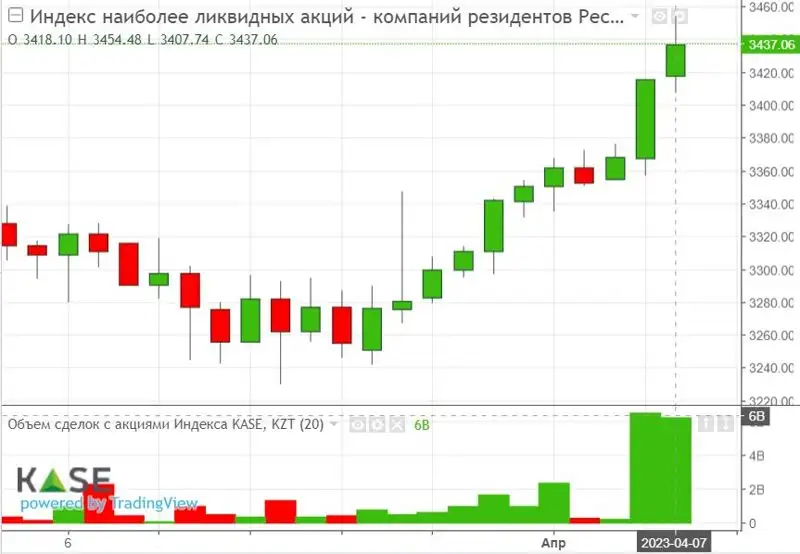 Индекс KASE за торговую неделю с 3 по 7 апреля вырос на + 85,83 пункта, или на +2,56%, с 3 351,23 до 3437,06 пункта, достигнув максимума с конца февраля 2022 года.