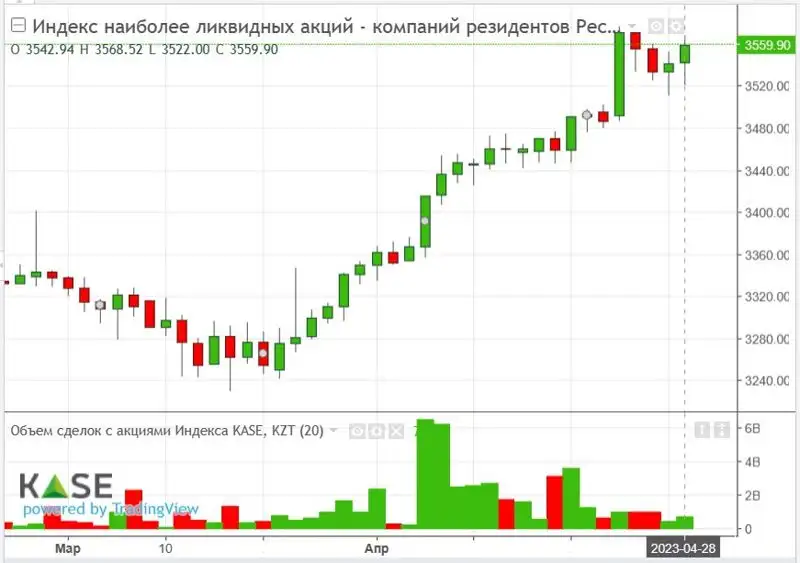 Индекс KASE растет с 24 марта в течение 25 сессий за исключением торгов 4 апреля, когда его значение несколько упало – на -0,28%, 18 апреля (-0,33%), 21 апреля (-0,33%). В понедельник 24 апреля индекс резко взлетел на +2,43%. Однако во вторник и среду 25 и 26 апреля прошла коррекция вниз. Значение индекса выросло до уровня 21 февраля 2022 года, достигнув практически 15-месячного максимума. За месяц индекс KASE вырос на +7,38% до 3 559,90 пункта (+72,52 пункта) или на +92,6 в годовом выражении. Неделей ранее показатель вырос на +34,61 пункта или на +1,00% с 3 461,28 до 3 495,89 пункта.