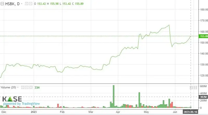Акции Народного банка после дивидендной отсечки, в экс-дивидендный день 29 мая ожидаемо просели до 144,00 тенге за акцию (на -20,05 пункта или на -13,7%). Однако уже на следующий день начали отрастать. На 15.35 по времени Астаны пятницы 16 июня последняя сделка по HSBK зафиксирована на уровне 155,01 тенге за акцию (+1,05% по сравнению с закрытием четверга 15 июня).