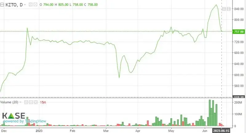 В минувший понедельник акции КазТранОйла (тикер KZTO) достигли своего максимума с 25 апреля прошлого года, закрывшись на уровне 854,97 тенге за бумагу. Объем торгов составил 185 млн тенге. Однако уже на следующий день объем упал до 3 млн тенге, а котировки снизились на -1,75%. Дальше падение пошло более круто. И это притом, что KZTO был лидером роста в течение нескольких сессий подряд. Резкая смена картины торгов в среду побудила к фиксации позиций, что при сниженной ликвидности привело к заметной просадке котировок.