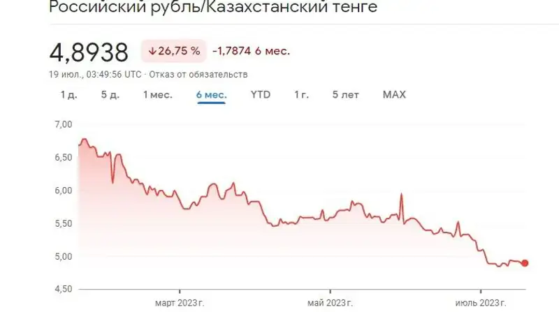 Курс российского рубля по отношению к тенге также демонстрирует снижение. Если еще год назад курс достигал показателя 8,3 тенге за рубль, то сегодня он опустился до 4,9.