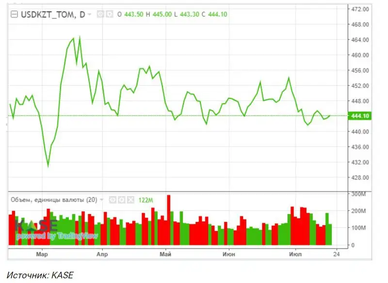 По итогам торгов курс вырос до отметки 443,98 тенге за доллар. При этом торговая активность на рынке снизилась. Отметим, что в среду курс укрепился до 442,68 тенге за доллар.