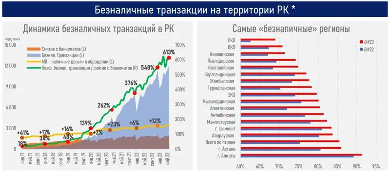 Лучшие показатели проникновения безналичных транзакций (86%) в разрезе регионов отмечаются лишь у Астаны (+0,4 п.п.) и Алматы (+5,8 п.п.); "цифровой разрыв" свыше 10 п.п. сохраняется в Костанайской (-11 п.п.), Павлодарской (-11 п.п.), Акмолинской областях (-14 п.п.), в ВКО (-15 п.п.) и СКО (-17 п.п.). Эти регионы представляют основной потенциал роста оборота безнала в ближайшей перспективе.