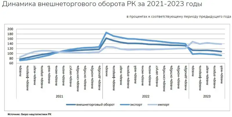 Согласно информации Бюро национальной статистики, внешнеторговый оборот Казахстана за полугодие составил 67,2 млрд долларов, что на 4,3% больше в сравнении с аналогичным периодом прошлого года.