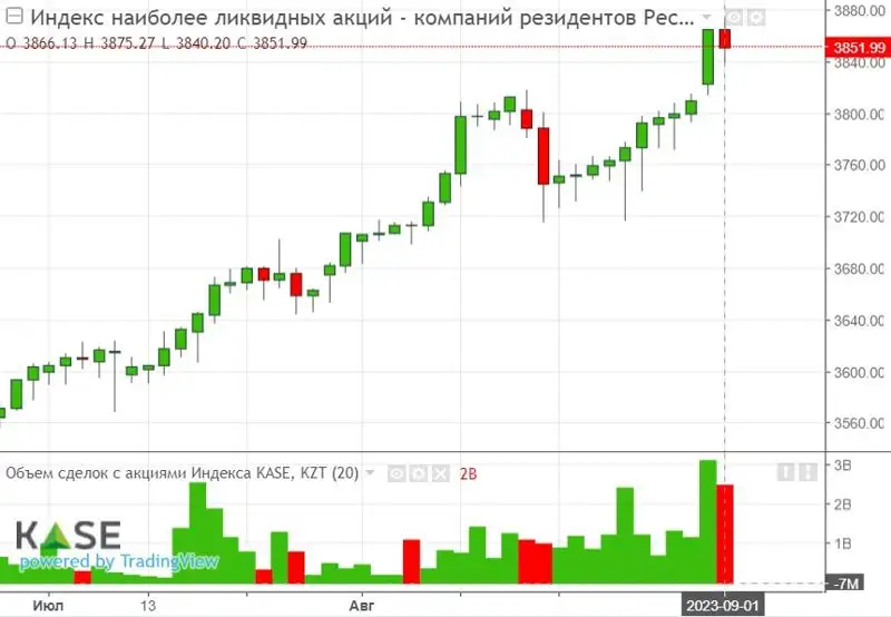 Индекс KASE за неделю вырос на 54,76 пункта (+1,44%) с 3 797,23 до 3 851,99 пункта. При этом был заметно снижение на -0,37% в минувшую пятницу 1 сентября.