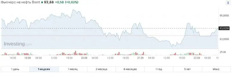 В понедельник, 18 сентября, баррель нефти марки Brent торговался по 94,43 доллара. Во вторник его цена выросла до 95,96 доллара, снизившись в среду до 93,53 доллара. В четверг стоимость "черного золота" составила 93,25, временами достигая 92,20 доллара за бочку. В пятницу нефть вновь подросла до 93,88 доллара за баррель.
