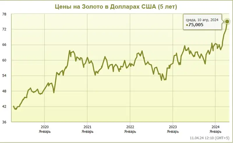 Только с начала 2024 года цена одного грамма золота в Казахстане выросла на 3415 тенге. Утром 1 января один грамм золота (котировка НБРК) стоил 30 323,51 тенге, утром 11 апреля – 33 738,80 тенге.