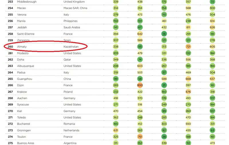 Алматы обошел такие крупные и всемирно известные города мира, как Доха (Катар), Краков (Польша), Буэнос-Айрес (Аргентина), Шанхай (КНР), Москва (Россия) и т. д.