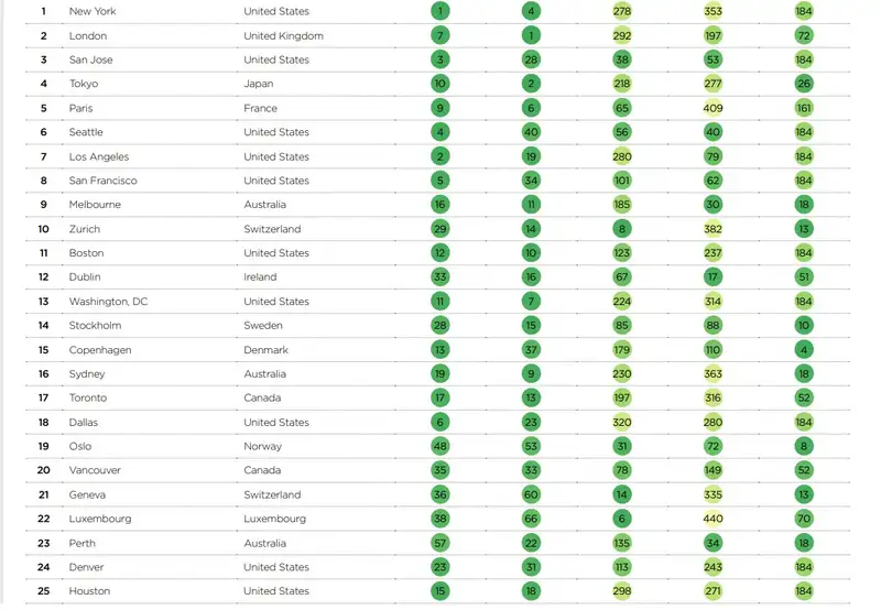 Согласно результатам оценки, в топ-50 лидируют территории США и Европы, а ведущими городами мира стали Нью-Йорк, Лондон, Сан-Хосе (штат Калифорния).