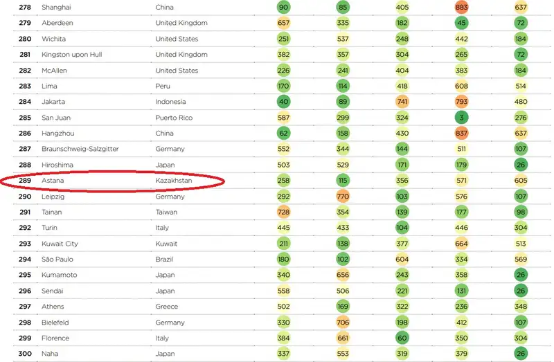 У Астаны: экономика – 258-е место из 1000, человеческий капитал – 115-е, качество жизни – 356-е, окружающая среда – 571-е, управление – 605-е.