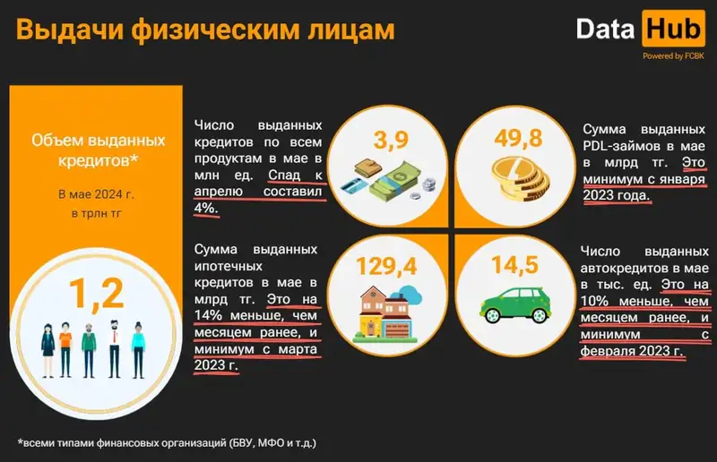 "Майские результаты – худшие за почти полтора года. Правда, снижение относительно апреля само по себе не выглядит сильным. Его темпы не превысили 4% как в случае с суммой выдач – 49,8 млрд тенге, так и их числом – 739,5 тыс. единиц". ПКБ