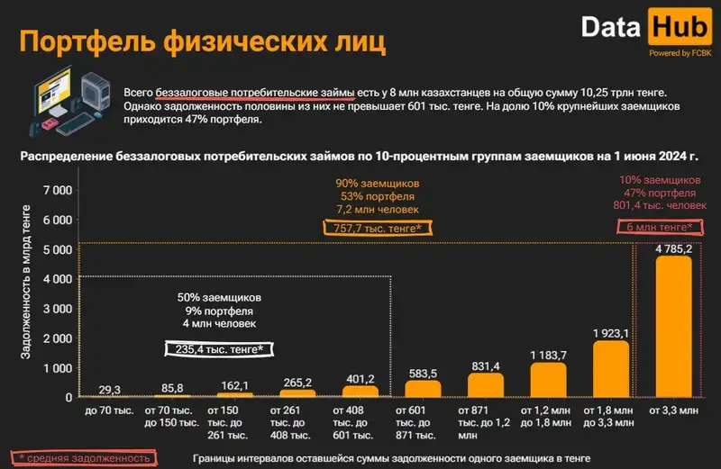 "Абсолютные значения составляют 855,5 млрд тенге и 2,9 млн единиц. Стоит отметить, что средняя сумма подобного займа в сравнении с другими продуктами остается небольшой – 290,9 тыс. тенге", – говорится в обзоре ПКБ.