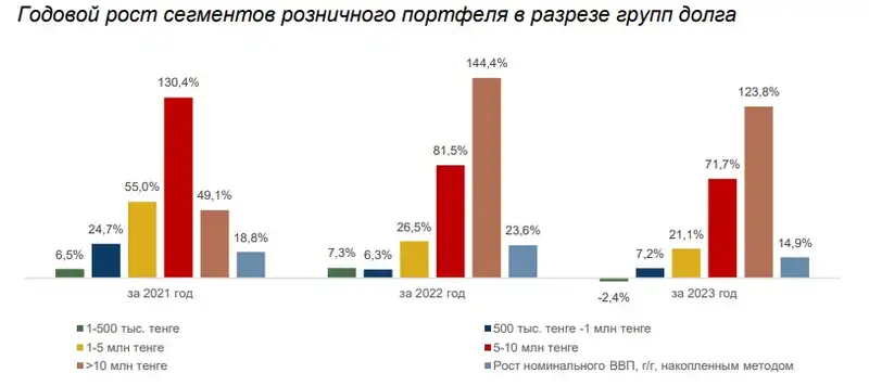 При этом при сравнении темпов роста сегментов розничного портфеля и темпов роста номинального ВВП видно, что в 2022 и 2023 годах рост долга превышает рост номинального ВВП только для заемщиков, чей совокупный долг более 1 млн тенге. Согласно данным Нацбанка, портфель БПЗ физических лиц с наиболее крупной задолженностью (более 10 млн тенге) вырос в 2023 году на 123,8%, а портфель от 5 до 10 млн тенге вырос на 71,7%.