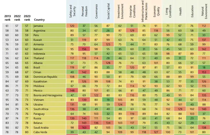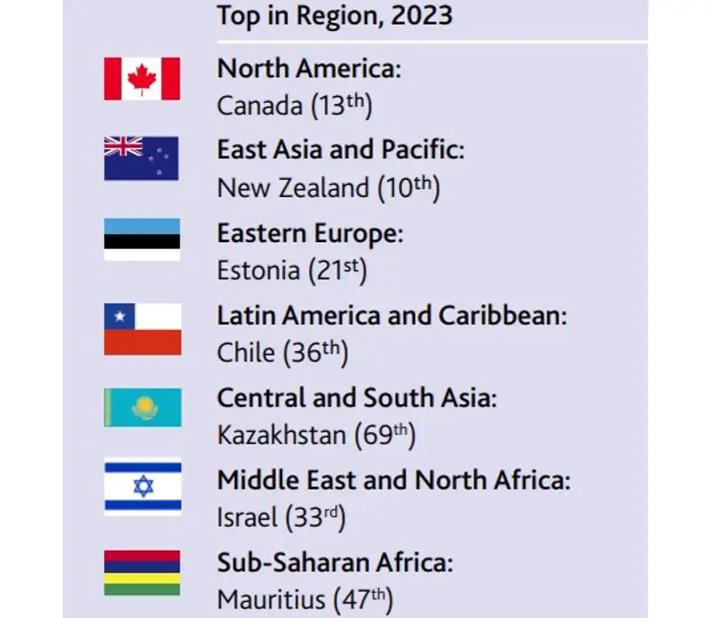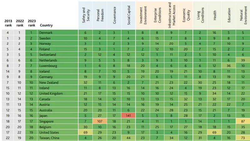 Первую тройку лидеров рейтинга традиционно занимают скандинавские страны. Дания заняла 1-е место с индексом 84,5, Швеция на 2-м месте с индексом 83,6, а Норвегия замыкает тройку с индексом 84. Эти страны стабильно демонстрируют высокие результаты в таких областях, как качество жизни, социальная защита и устойчивое развитие. При этом Дания занимает лидирующие позиции в каждой ключевой области. Исследователи отдельно отмечают высокий уровень доверия граждан Дании к судебной системе (небывалые для нас 86%). Сингапур, Гонконг и Финляндия признаны странами с лучшей инвестиционной средой.