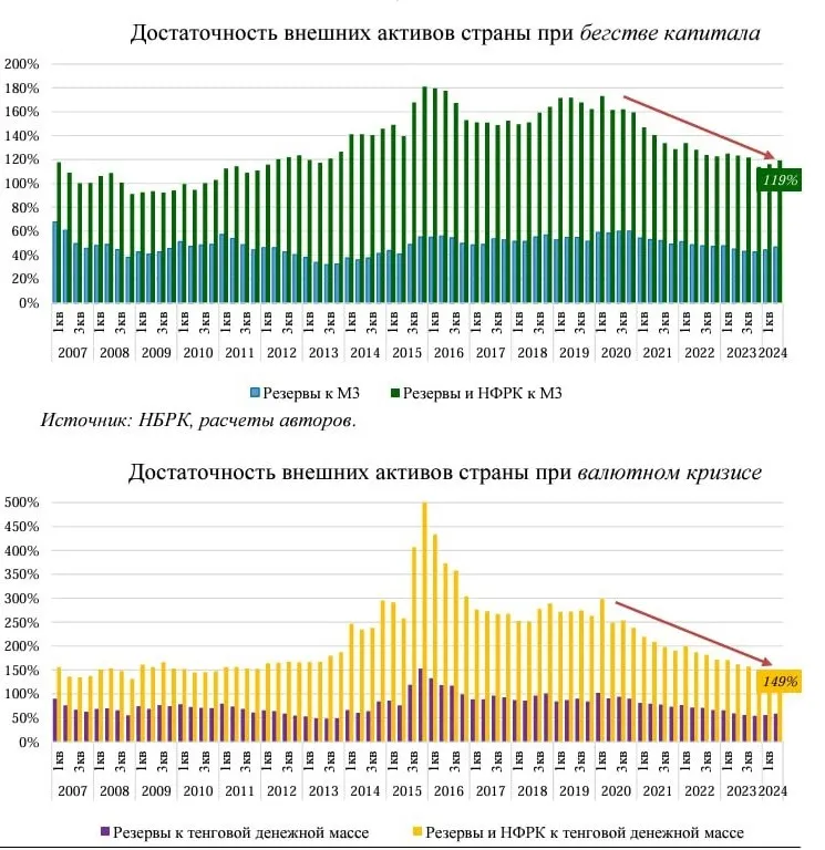"Как правило, рост экономики сопровождается ростом потребностей страны в валютных резервах относительно объемов экономики. Однако активное изъятие средств из НФРК не способствует дальнейшему увеличению подушки безопасности страны".Исследование Национального банка РК