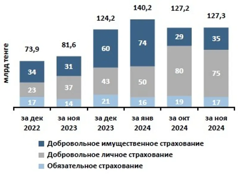 Значительно вырос за 11 месяцев прошлого года и объем страховых премий, принятых по договорам страхования (перестрахования), – на 52,7% по сравнению с январем-ноябрем 2023 года до 1,3 трлн тенге. При этом по страховым премиям, принятым по обязательному страхованию, сложился прирост 29,0% до 223,5 млрд тенге, по добровольному личному страхованию – 123,4% до 701,3 млрд тенге, по добровольному имущественному страхованию – 6,3% до 413,3 млрд тенге.