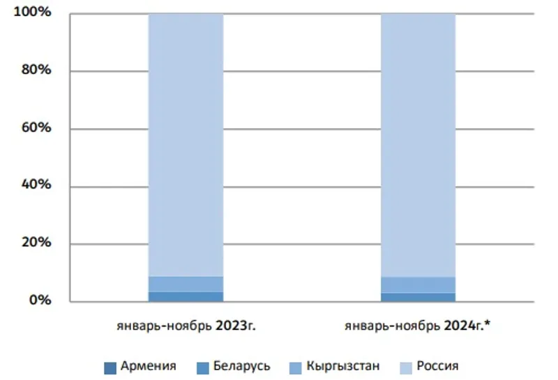 В общем объеме наибольшую долю занимает Российская Федерация – 91%, далее следуют Кыргызская Республика – 5,8%, Республика Беларусь – 3,1% и Армения – 0,1%.