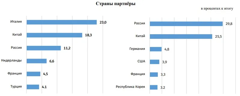 Основным партнером Казахстана по экспорту стала Италия (23%). Далее следуют Китай (18,3%), Россия (11,2%), Нидерланды (6,6%), Франция (4,5%), Турция (4,1%).