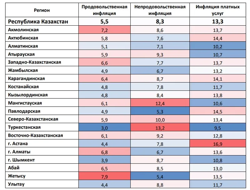 Добавим, что Астана также лидирует по росту цен на платные услуги +16,9%. Далее следуют Павлодарская (14,5%), Актюбинская (14,4%) и Карагандинская (14,1%) области.