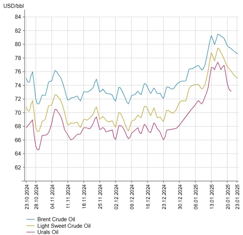 Минэнерго США ожидает среднюю цену нефти Brent в 2025 году на уровне 73,58 доллара за баррель. Эксперты считают, что страны ОПЕК+ и государства, не входящих в альянс, увеличат добычу нефти, что компенсирует потери от поставок российского и иранского сырья.