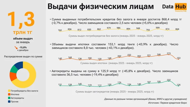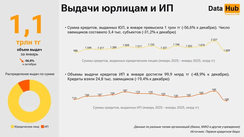 Общая сумма выдач юридическим лицам и ИП составила 1,1 трлн тенге. Это также на 56% ниже, чем было в декабре, когда объемы были традиционно повышенными, отмечается в сообщении бюро. В годовом выражении суммы без поправки на инфляцию практически не изменились (+1%).