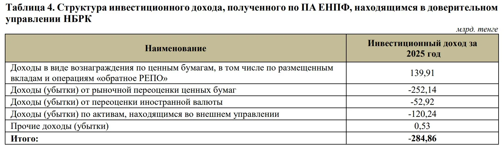 Как уточнили в фонде, в результате инвестиционной деятельности, а также вследствие волатильности курсов иностранных валют и изменения рыночной стоимости финансовых инструментов, размер начисленного инвестиционного дохода за январь-2025 составил минус 284,86 млрд тенге.