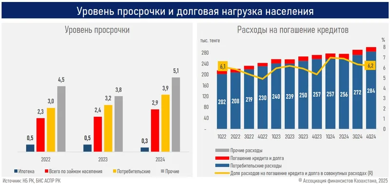 Аналитики также обратили внимание, что долговая нагрузка населения остается умеренной. В частности, доля расходов на погашение кредита в общих расходах казахстанцев составляет 6,2% (ранее 5,3%), а основную долю сохраняют продукты питания.