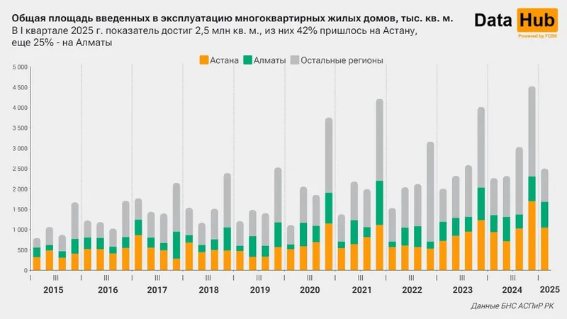 "В первом квартале 2025 года в двух городах введены в эксплуатацию многоквартирные дома суммарной общей площадью 1,7 млн квадратных метров, что сформировало 67% от показателя по стране. Эта доля стала самой высокой для любого квартала с первым кварталом 2017 года. При этом сами показатели общей площади как для всей страны, так и для Алматы и Астаны в отдельности стали максимальными для января-марта, по крайней мере, с 2015 года".ПКБ