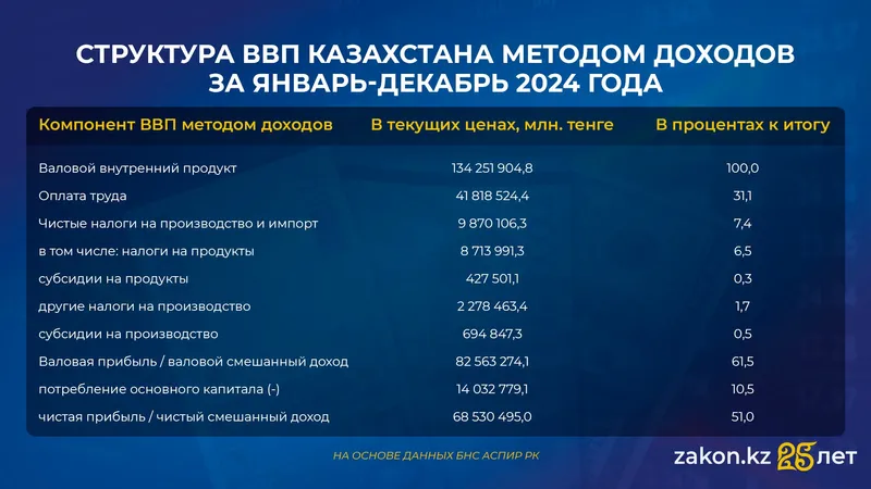 Подсчет методом доходов отражает не объем производства, а то, как созданная в экономике стоимость распределяется между ключевыми участниками: государством, наемными работниками и собственниками капитала. Общий объем ВВП за этот период составил 134,3 трлн тенге.
