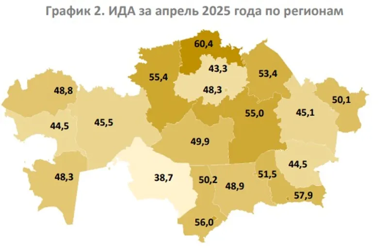 В сообщении отмечается, что в 9 регионах деловая активность улучшилась, в 11 регионах – ухудшилась. Наибольшее значение индекса зафиксировано в Северо-Казахстанской области (60,4), наименьшее – в Кызылординской области (38,7). К слову, в некоторых южных регионах деловая активность в апреле была заметно ниже, чем в СКО.