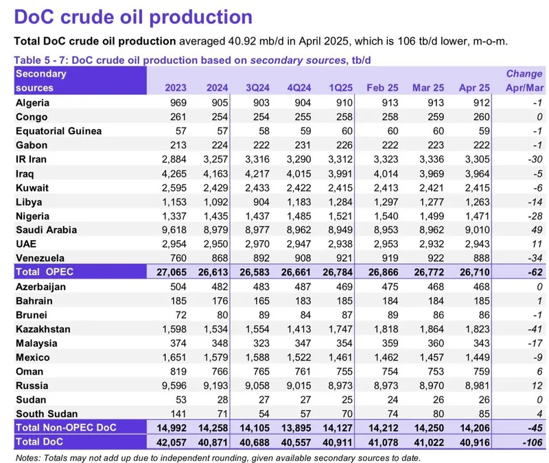 В апреле 2025 года общая добыча нефти странами расширенной группы ОПЕК+ зафиксировала снижение на 106 тыс. баррелей в сутки, составив 40,92 млн. Отчет детализирует разнонаправленную динамику среди участников: Саудовская Аравия нарастила добычу на 49 тыс. баррелей в сутки, а Россия – на 12 тыс. При этом ряд стран сократили производство, включая Казахстан (снижение на 41 тыс. баррелей в сутки, до 1,823 млн баррелей в сутки), Венесуэлу (падение на 34 тыс. баррелей в сутки), а также Иран, Ливию и Нигерию.