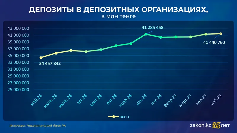 В мае 2025 года объем депозитов в депозитных организациях увеличился незначительно по сравнению с предыдущим месяцем – всего на 0,3% до 41,4 трлн тенге. При этом с января их объем вырос на 2,6%, или более чем на один триллион тенге, согласно статданным Национального банка РК.