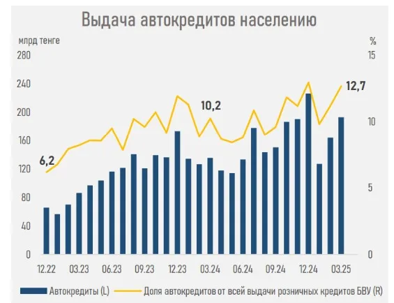 "На займы в диапазоне 3-10 млн тенге теперь приходится 75,2% всех заемщиков против показателя в 66,4% годом ранее. Это отражает как умеренный рост цен на авто в стране, так и перераспределение спроса в сторону доступных по цене моделей, особенно в условиях усиленной конкуренции между автодилерами". Аналитический центр АФК