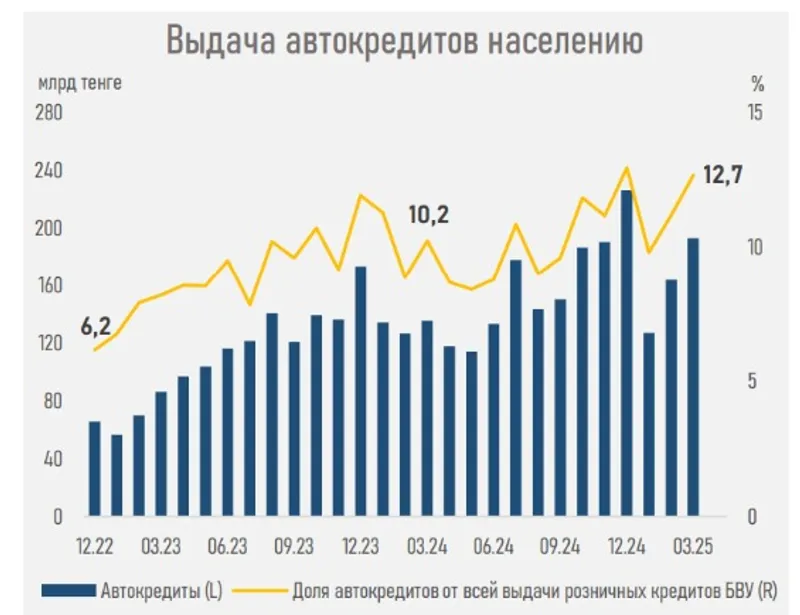 По данным аналитического центра АФК, только за январь-март текущего года было выдано 213 тыс. автокредитов на сумму 483 млрд тенге. Это на 36% больше аналогичного показателя за 2024 год в количестве (156 тыс.) и на 22% по объему (395 млрд тенге).