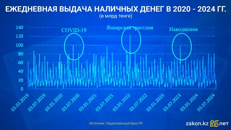 Среднедневная выдача наличных денег составляет 26 млрд тенге. При этом в период нестабильности происходит резкий всплеск спроса на наличные деньги. К примеру, в начале объявления пандемии коронавируса в Казахстане дневная выдача составила 100 млрд тенге (в 4 раза больше среднедневной выдачи), а в период январской трагедии в Казахстане выдача составила 123 млрд тенге (в 5 раз больше среднедневной выдачи).